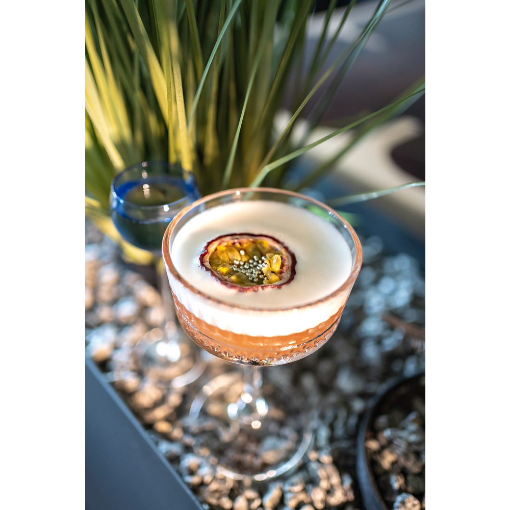 Сік: вишня та гранат з медом та спеціями(гвоздика та кориця), для гарного візуального ефекту(пінки) додаємо піноутворювач, та гарніруємо апельсином